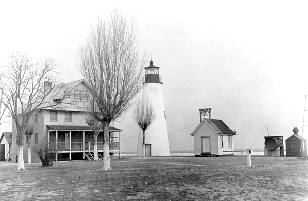 This light was built in 1828 by John Donahoo, who erected a 36 foot brick conical tower along the plan that he has used at several other sites in the Bay. In 1825 Congress had allocated funds to build a light at Cedar Point, four miles south at the mouth of the Patuxent River, but further consideration led to a decision to mark Cove Point and the shoal which jutted into the bay. A new appropriation in 1828 allowed construction of the light and the keepers house in the same year. James Somerville was the first keeper of the light, which first shown in December 1828. The original Argand lamps were replaced in 1855 with a fifth-order Fresnel lens; this in turn was upgraded to a fourth-order lens in 1857. A fog bell added in 1837 was moved several times and was mounted on both wood and iron frames before ending up on the roof of a wooden shed built in 1902 to house a fog horn.The foghorn equipment was moved in 1950 to a separate brick building, but the fog bell remains on the shed. Erosion was a significant problem, but was eventually brought under control through a seawall initially constructed in 1892 and upgraded in 1913 and 1993. The keeper's house was enlarged in 1881 when it was converted to a duplex with housing for two keepers and their families, and again in 1925 when inside kitchens were installed. In 1950 a separate small house was built as a home to a third keeper and his family. The lighthouse was completely automated in 1986. Cove Point remains an active aid to navigation and is the oldest continuously operating lighthouse on the Chesapeake Bay.